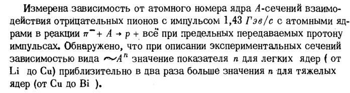 Измерена зависимость от атомного номера ядра Л-сечений взаимодействия отрицательных пионов с импульсом 1,43 Гэв/с с атомными ядрами в реакции π~+ А -> ρ + всё при предельных передаваемых протону импульсах. Обнаружено, что при описании экспериментальных сечений зависимостью вида ^Ап значение показателя η для легких ядер ( от Li до Си) приблизительно в два раза больше значения η для тяжелых ядер (от Си до Bi ).