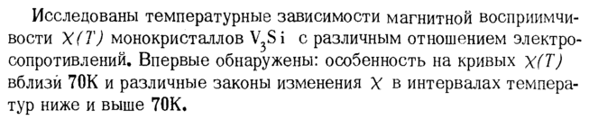 Исследованы температурные зависимости магнитной восприимчивости Х(Т) монокристаллов V3Si с различным отношением электросопротивлений. Впервые обнаружены: особенность на кривых χ(Τ) вблизи 70К и различные законы изменения X в интервалах температур ниже и выше 70К,