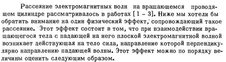 Рассеяние электромагнитных волн на вращающемся проводящем цилиндре рассматривалось в работах [1 3]. Ниже мы хотели бы обратить внимание на один физический эффект,' сопровождающий такое рассеяние. Этот эффект состоит в том, что при взаимодействии вращающегося тела с падающей на него плоской электромагнитной волной возникает действующая на тело сила, направление которой перпендикулярно направлению падающей волны. Этот эффект можно по порядку величины оценить следующим образом.
