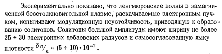Экспериментально показано, что ленгмюровские волны в замагни-ченной бесстолкновительной плазме, раскачиваемые электронным пучком, испытывают модуляционную неустойчивость, приводящую к образованию солитонов. Солитоны большой амплитуды имеют ширину не более 25 τ 30 электронных дебаевских радиусов и самосогласованную ямку плотности δ п/п « (5 * 10). 10"2.