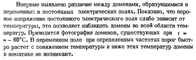 Впервые выявлено различие между доменами, образукщимися в переменных и постоянных электрических полях. Показано, что поро-вое напряжение постоянного электрического поля слабо зависит от температуры, это позволяет наблюдать домены во всей области температур. Приводится фотография доменов, существующих при г = = 60°С. В переменном поле при определенных частотах порог быстро растет с понижением температуры и ниже этих температур домены в нематике не возникают.