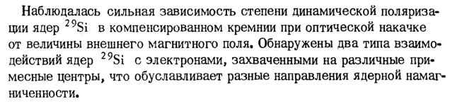 Наблюдалась сильная зависимость степени динамической поляризации ядер 2 9Si в компенсированном кремнии при оптической накачке от величины внешнего магнитного поля. Обнаружены два типа взаимодействий ядер 29Si с электронами, захваченными на различные примесные центры, что обуславливает разные направления ядерной намагниченности.