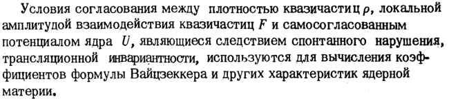 Условия согласования между плотностью квазичастиц р, локальной амплитудой взаимодействия квазичастиц F и самосогласованным потенциалом ядра U, являющиеся следствием спонтанного нарушения, трансляционной инвариантности, используются для вычисления коэффициентов формулы Вайцзеккера и других характеристик ядерной материи.