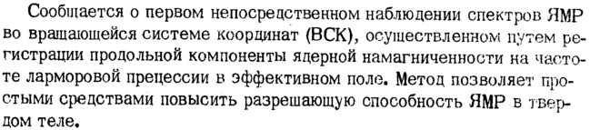 Сообщается о первом непосредственном наблюдении спектров ЯМР во вращающейся системе координат (ВСК), осуществленном путем регистрации продольной компоненты ядерной намагниченности на частоте ларморовой прецессии в эффективном поле. Метод позволяет простыми средствами повысить разрешающую способность ЯМР в твердом теле.