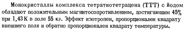 Монокристаллы комплекса тетратиотетрацена (ТТТ) с йодом обладают положительным магнитосопротивлением, достигающим 45% при 1,43 К в поле 55 %э. Эффект изотропен, пропорционален квадрату внешнего поля и обратно пропорционален квадрату температуры.