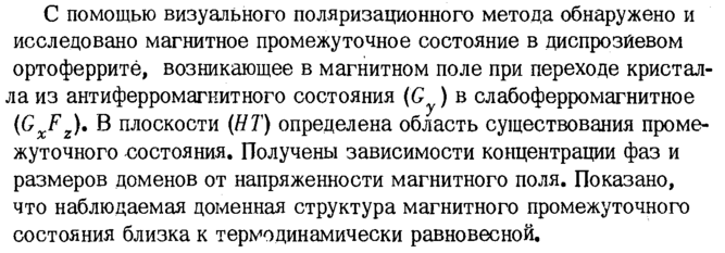 С помощью визуального поляризационного метода обнаружено и исследовано магнитное промежуточное состояние в диспрозйевом ортоферритё, возникающее в магнитном поле при переходе кристалла из антиферромагнитного состояния (Gy) в слабоферромагнитное (GXFZ). В плоскости (ΗТ) определена область существования промежуточного состояния. Получены зависимости концентрации фаз и размеров доменов от напряженности магнитного поля. Показано, что наблюдаемая доменная структура магнитного промежуточного состояния близка к термодинамически равновесной.