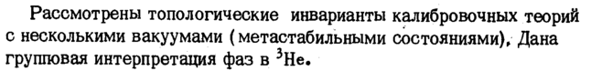 Рассмотрены топологические инварианты калибровочных теорий с несколькими вакуумами (метастабильными состояниями), Дана групповая интерпретация фаз в 3Не.