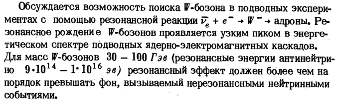 Обсуждается возможность поиска F-бозона в подводных экспериментах с помощью резонансной реакции ίζ + β"-»ΙΓ"-* адроны. Резонансное рождение 7-бозонов проявляется узким пиком в энергетическом спектре подводных ядерно-электромагнитных каскадов. Для масс f-бозонов 30 100 Гэ в (резонансные энергии антинейтрино 9·1014 — 1·10169β^ резонансный эффект должен более чем на порядок превышать фон, вызываемый нерезонансными нейтринными событиями.