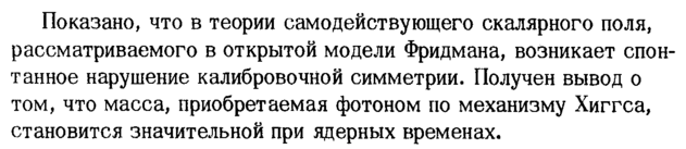 Показано, что в теории самодействующего скалярного поля, рассматриваемого в открытой модели Фридмана, возникает спонтанное нарушение калибровочной симметрии. Получен вывод о том, что масса, приобретаемая фотоном по механизму Хиггса, становится значительной при ядерных временах.