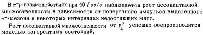 В 7Гр-взаимодействиях при 40 Гэв/с наблюдается рост ассоциативной множественности в зависимости от поперечного импульса выделенного тГ"-мезона в некоторых интервалах недостающих масс. Рост ассоциативной множественности от успешно воспроизводится моделью когерентных состояний.