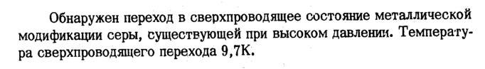Обнаружен переход в сверхпроводящее состояние металлической модификации серы, существующей при высоком давлении. Температура сверхпроводящего перехода 9,7К.