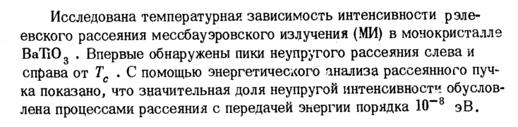 Исследована температурная зависимость интенсивности рэле-евского рассеяния мессбауэровского излучения (МИ) в монокристалле ВаТЮ3 . Впервые обнаружены пики неупругого рассеяния слева и справа от Тс . С помощью энергетического анализа рассеянного пуч-ка показано, что значительная доля неупругой интенсивности обусловлена процессами рассеяния с передачей энергии порядка 10~8 эВ.