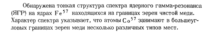 Обнаружена тонкая структура спектра ядерного гамма-резонанса (ЯГР) на ядрах Fe57 находящихся на границах зерен чистой меди. Характер спектра указывает, что атомы Со57 занимают в большеуг-ловых границах зерен меди несколько различных типов мест.