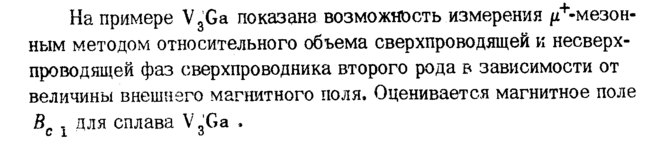 На примере V3'Ga показана возможность измерения μ-мезон-ным методом относительного объема сверхпроводящей к несверхпроводящей фаз сверхпроводника второго рода в зависимости от величины внешнего магнитного поля. Оценивается магнитное поле Вс χ для сплава V3'Ga .