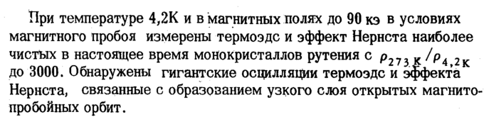 При температуре 4,2К и в магнитных полях до 90 кэ в условиях магнитного пробоя измерены термоэдс и эффект Нернста наиболее чистых в настоящее время монокристаллов рутения с р273 к2К до 3000. Обнаружены гигантские осцилляции термоэдс и эффекта Нернста, связанные с образованием узкого слоя открытых магнито-пробойных орбит.