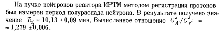 На пучке нейтронов реактора ИРТМ методом регистрации протонов был измерен период полураспада нейтрона. В результате получено значение Гу = 10,13 ±0,09 мин. Вычисленное отношение G'A/Gy> = 1,279 ±t),006.