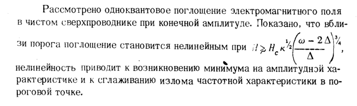 Рассмотрено одноквантовое поглощение электромагнитного поля в чистом сверхпроводнике при конечной амплитуде. Показано, что вблизи порога поглощение становится нелинейным при ■:{> Η к//—-—^]'* нелинейность приводит к возникновению минимума на амплитудной характеристике и к сглаживанию излома частотной характеристики в пороговой точке.