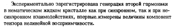 Экспериментально зарегистрирована генерация второй гармоники в нематическом жидком кристалле как при синхронном, так и при несинхронном взаимодействиях, впервые.измерены величины компонент тензора нелинейной восприимчивости.