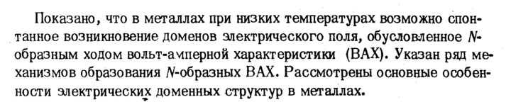 Показано, что в металлах при низких температурах возможно спонтанное возникновение доменов электрического поля, обусловленное Ν· образным ходом вольт-амперной характеристики (ΒΑΧ). Указан ряд механизмов образования /v-образных ΒΑΧ. Рассмотрены основные особенности электрических доменных структур в металлах.