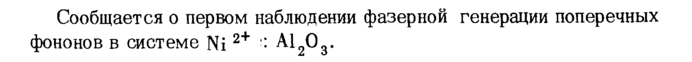 Сообщается о первом наблюдении фазерной генерации поперечных фононов в системе Ni 2+ '■· А1203.