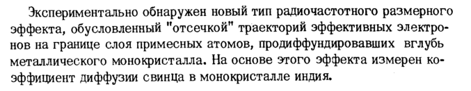 Экспериментально обнаружен новый тип радиочастотного размерного эффекта, обусловленный "отсечкой" траекторий эффективных электронов на границе слоя примесных атомов, продиффундировавших вглубь металлического монокристалла. На основе этого эффекта измерен коэффициент диффузии свинца в монокристалле индия.