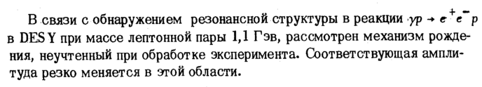 В связи с обнаружением резонансной структуры в реакции ур -+ е-+е~р в DESY при массе лептонной пары 1,1 Гэв, рассмотрен механизм рождения, неучтенный при обработке эксперимента. Соответствующая амплитуда резко меняется в этой области.