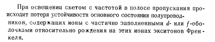При освещении светом с частотой в полосе пропускания происходит потеря устойчивости основного состояния полупроводников, содержащих ионы с частично заполненными dили /-оболочками относительно рождения на этих ионах экситонов Френкеля.