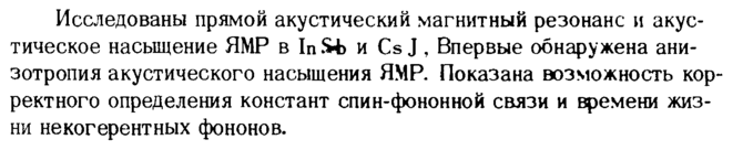 Исследованы прямой акустический магнитный резонанс и акустическое насыщение ЯМР в In S«b и Cs J , Впервые обнаружена анизотропия акустического насыщения ЯМР. Показана возможность корректного определения констант спин-фононной связи и времени жизни некогерентных фононов.