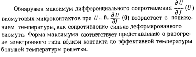 Обнаружен максимум дифференциального сопротивления --(U) д 11 висмутовых микроконтактов при ί/= П. (0) возрастает с понижением температуры» как сопротивление сильно деформированного висмута. Форма максимума соответствует представлению о разогреве электронного газа вблизи контакта до эффективной температуры большей температуры решетки.