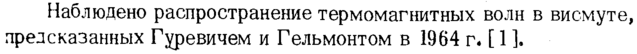 Наблюдено распространение термомагнитных волн в висмуте, предсказанных Гуревичем и Гельмонтом в 1964 г. [ 1 ].