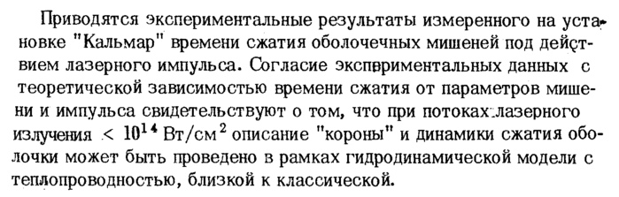 Приводятся экспериментальные результаты измеренного на установке "Кальмар" времени сжатия оболочечных мишеней под действием лазерного импульса. Согласие экспериментальных данных с теоретической зависимостью времени сжатия от параметров мишени и импульса свидетельствуют о том, что при потоках.лазерного излучения < Ю1* Вт/см2 описание "короны" и динамики сжатия оболочки может быть проведено в рамках гидродинамической модели с теплопроводностью, близкой к классической.