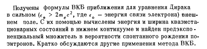 Получены формулы ВКБ приближения для уравнения Дирака в сильном (io > 2тес2, где ео — энергия связи электрона) внешнем поле. С их помощью вычислены энергия и ширина квазистационарных состояний в нижнем континууме и найден предэкспо -ненциальный множитель в вероятности спонтанного рождения позитронов. Кратко обсуждаются другие применения метода ВКБ.