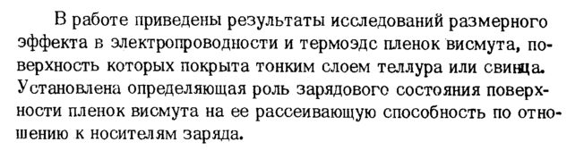 В работе приведены результаты исследований размерного эффекта в электропроводности и термоэдс пленок висмута, поверхность которых покрыта тонким слоем теллура или свища. Установлена определяющая роль зарядового состояния поверхности пленок висмута на ее рассеивающую способность по отношению к носителям заряда.