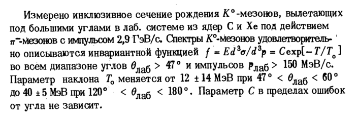Измерено инклюзивное сечение рождения К "-мезонов, вылетающих под большими углами в лаб. системе из ядер С и Хе под действием тГ-мезонов с импульсом 2,9 ГэВ/с Спектры К°-мезонов удовлетворитель-' но описываются инвариантной функцией / = Edtydsp = Сехр[-Г/Го] во всем диапазоне углов 0лаб > 47° и импульсов рлаб > 150 МэВ/с. Параметр наклона Т0 меняется от 12 +14МэВ при 47° < 0даб < 60° до 40 + 5 МэВ при 120° < 0даб < 180°. Параметр С в пределах ошибок от угла не зависит.