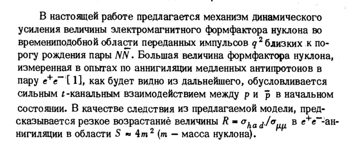 В настоящей работе предлагается механизм динамического усиления величины электромагнитного формфактора нуклона во времениподобной области переданных импульсов q 2 близких к порогу рождения пары NN. Большая величина формфактора нуклона, измеренная в опытах по аннигиляции медленных антипротонов в пару е+е~ [ 1], как будет видно из дальнейшего, обусловливается сильным t -канальным взаимодействием между ρ и ρ в начальном состоянии. В качестве следствия из предлагаемой модели, предсказывается резкое возрастание величины R σ^αά^σμμ в е+е~"ан_ нигиляции в области S » 4m2 (т — масса нуклона).