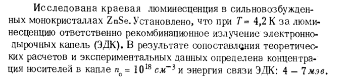 Исследована краевая люминесценция в сильновозбужденных монокристаллах ZnSe, Установлено, что при Т= 4,2 К за люминесценцию ответственно рекомбинационное излучение электронно-дырочных капель (ЭДК). В результате сопоставления теоретических расчетов и экспериментальных данных определена концентрация носителей в капле по = Ю18 слГ3 и энергия связи ЭДК: 4 Чмэв.