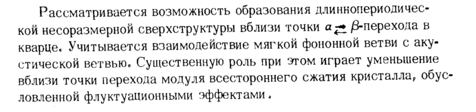 Рассматривается возможность образования длиннопериодичес-кой несоразмерной сверхструктуры вблизи точки β-перехода в кварце* Учитывается взаимодействие мягкой фононной ветви с акустической ветвью* Существенную роль при этом играет уменьшение вблизи точки перехода модуля всестороннего сжатия кристалла, обусловленной флуктуационными эффектами.