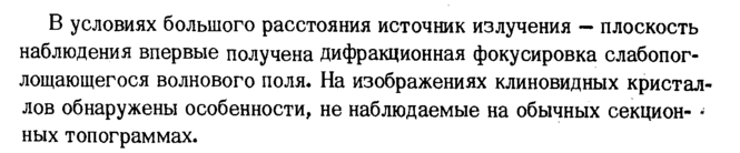 В условиях большого расстояния источник излучения плоскость наблюдения впервые получена дифракционная фокусировка слабопог-лощающегося волнового поля. На изображениях клиновидных кристаллов обнаружены особенности, не наблюдаемые на обычных секцион* ных топограммах.