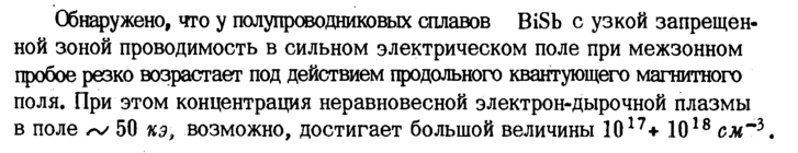 Обнаружено, что у полупроводниковых сплавов BiSb с узкой запрещенной зоной проводимость в сильном электрическом поле при межзонном пробое резко возрастает под действием продольного квантующего магнитного поля. При этом концентрация неравновесной электрон-дырочной плазмы в поле ^ 50 кэ, возможно, достигает большой величины 1017+ 1018 еж"*3.