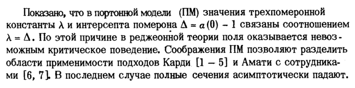 Показано, что в портонной модели (ПМ) значения трехпомеронной константы λ и интерсепта померона Δ = а (0) 1 связаны соотношением λ = Δ. По этой причине в реджеонной теории поля оказывается невоз -можным критическое поведение. Соображения ПМ позволяют разделить области применимости подходов Карди [1 — 5] и Амати с сотрудниками [6, 71 В последнем случае полные сечения асимптотически падают.