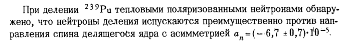 При делении 239Ри тепловыми поляризованными нейтронами обнаружено, что нейтроны деления испускаются преимущественно против направления спина делящегося ядра с асимметрией а^ = (—6,7 + 0,7)·1ι0""^.