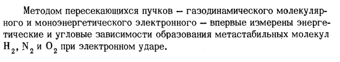 Методом пересекающихся пучков — газодинамического молекулярного и моноэнергетического электронного — впервые измерены энергетические и угловые зависимости образования метастабильных молекул Н2, N2 и 02 при электронном ударе.