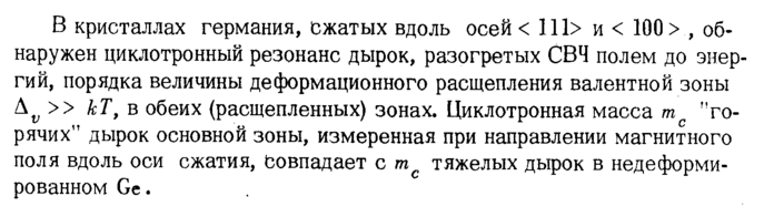В кристаллах германия, Сжатых вдоль осей < 111> и < 100 > , обнаружен циклотронный резонанс дырок, разогретых СВЧ полем до энергий, порядка величины деформационного расщепления валентной зоны \ >> кТг в обеих (расщепленных) зонах. Циклотронная масса тс "горячих1' дырок основной зоны, измеренная при направлении магнитного поля вдоль оси сжатия, Совпадает с тс тяжелых дырок в недеформи-рованном Ge.