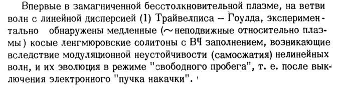 Впервые в замагниченной бесстолкновительной плазме, на ветви волн с линейной дисперсией (1) Трайвелписа Гоулда, экспериментально обнаружены медленные (~ неподвижные относительно плазмы ) косые ленгмюровские солитоны с ВЧ заполнением, возникающие вследствие модуляционной неустойчивости (самосжатия) нелинейных волн, и их эволюция в режиме "свободного пробега", т. е. после выключения электронного "пучка накачки". 1