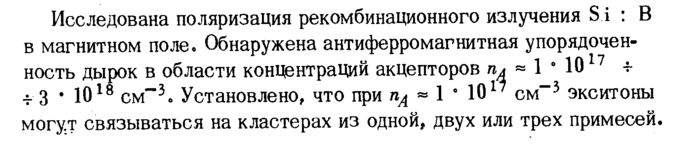 Исследована поляризация рекомбинационного излучения S i : В в магнитном поле. Обнаружена антиферромагнитная упорядоченность дырок в области концентраций акцепторов η л ~ 1 · 1017 * 43 ' Ю18 см-3. Установлено, что при пА » 1 · 1017 см-3 экситоны могут связываться на кластерах из одной, двух или трех примесей.