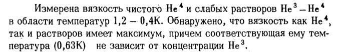 Измерена вязкость чистого Не* и слабых растворов Не3 —Не* в области температур 1,2 0,4К. Обнаружено, что вязкость как Не4, так и растворов имеет максимум, причем соответствующая ему температура (0,63К) не зависит от концентрации Не3.