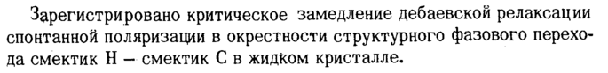 Зарегистрировано критическое замедление дебаевской релаксации спонтанной поляризации в окрестности структурного фазового перехода смектик Η смектик С в жидком кристалле.