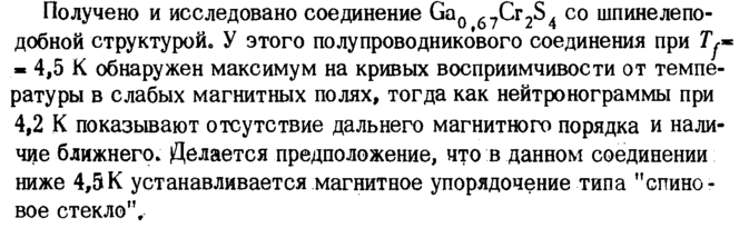 Получено и исследовано соединение Ga0 6?Cr2S4 со шпинелепо-добной структурой» У этого полупроводникового соединения при 7у« 4,5 К обнаружен максимум на кривых восприимчивости от температуры в слабых магнитных полях, тогда как нейтронограммы при 4,2 К показывают отсутствие дальнего магнитного порядка и наличие ближнего. Делается предположение, что в данном соединении ниже 4,5К устанавливается магнитное упорядочение типа "спиновое стекло".