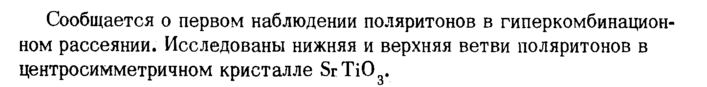 Сообщается о первом наблюдении поляритонов в гиперкомбинационном рассеянии. Исследованы нижняя и верхняя ветви поляритонов в центросимметричном кристалле SrTi03<