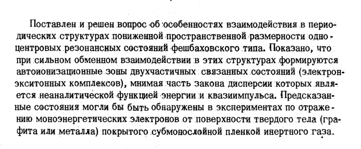 Поставлен и решен вопрос об :особенностях взаимодействия в периодических структурах пониженной пространственной размерности одно -центровых резонансных состояний фешбаховского типа. Показано, что при сильном обменном взаимодействии в этих структурах формируются автоионизационные зоны двухчастичных связанных состояний (электрон-экситонных комплексов), мнимая часть закона дисперсии которых является неаналитической функцией энергии и квазиимпульса. Предсказанные состояния могли бы быть обнаружены в экспериментах по отражен нию моноэнергетических электронов от поверхности твердого тела (графита или металла) покрытого субмонослойной пленкой инертного газа.